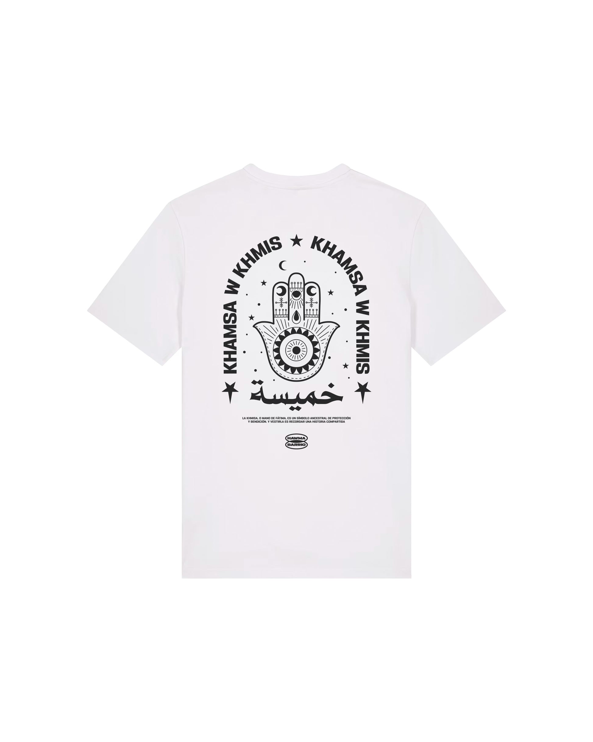 Camiseta de manga corta con diseño de Khmisa. Disponible en blanco. 180 GSM.